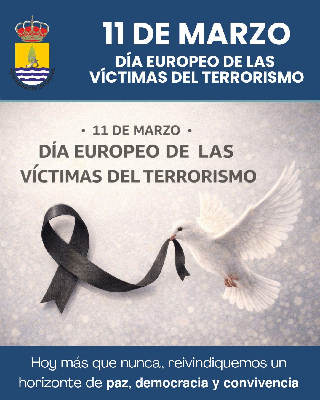 El Ayuntamiento de Gelves se suma a la conmemoración del 11 de marzo, Día Europeo de las Víctimas del Terrorismo, una fecha dedicada al recuerdo y reconocimiento de todas las personas que han sufrido las consecuencias de la violencia terrorista. Este año se cumplen 22 años de los atentados perpetrados en Madrid, que causaron la muerte de 193 personas y dejaron más de 2.000 heridas.