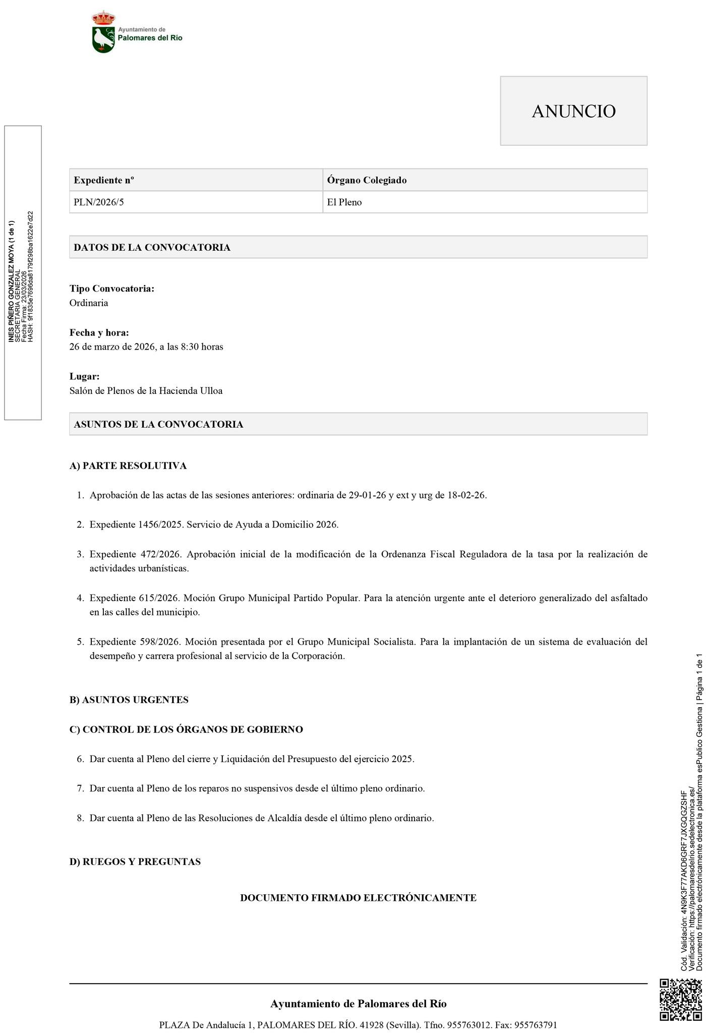 Palomares del Río PALOMARES DEL RÍO – 26/03/2026 8:30H – PLENO ORDINARIO FacebookTwitterPinterestWhatsApp 23 de marzo de 2026 Agencias Cuota FacebookTwitterPinterestWhatsApp Últimas noticias El Centro Andaluz de las Letras invita al historiador Eric Storm para conversar en torno a los movimientos nacionalistas contemporáneos La US, campeona de Andalucía La Facultad de Comunicación recibe a la investigadora Andrea Velásquez La revista Ámbitos se incorpora al índice europeo Diamond Discovery Hub La Diputación de Sevilla participa en el acto de UGT Andalucía por el 8M y en la entrega de los premios Luchadoras 2026 La ampliación del centro de día de la Asociación Albasur contará con 600.000 euros de la Junta La Junta licitará la obra del nuevo centro de salud del Mentidero de Cádiz a finales del mes de abril El centro de salud Esperanza de la Yedra de Jerez abrirá en mayo El Papa declara venerable a la religiosa esclava sevillana madre Belén del Corazón de Jesús